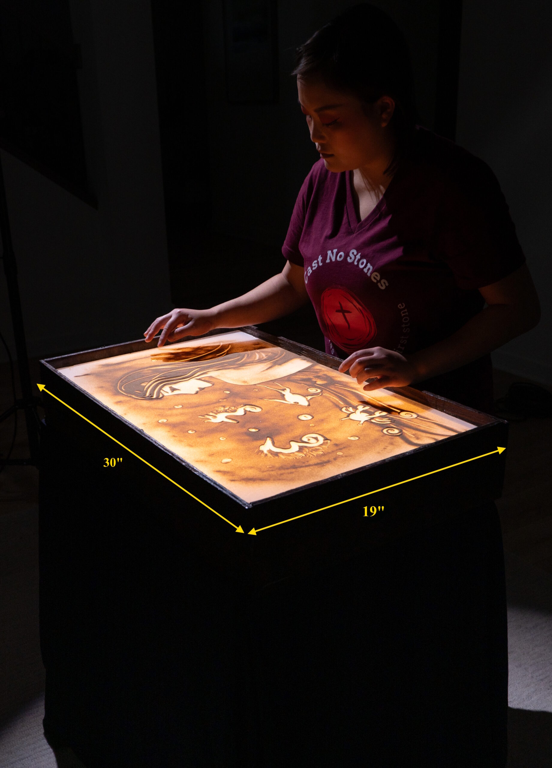 Just a heads-up for your AV team: I’ll need to share some technical requirements with them. This includes details like the lightbox size and the space needed for the sand art setup.